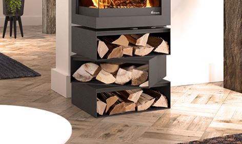 Dessa ”Cubes” är vedförvaringsförråd speciellt framtagna för hörnkaminen Bora hörna.