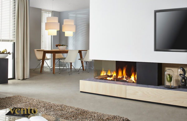 En lyxig 3-sidig ramlös gaskamin som är en korsning mellan en tunnel och hörnkamin. Med ett urval av ved eller stenfot är den utformad för att installeras som en rumsavdelare, så att den kan ses från båda sidor och ger både en värmekälla och dubbelt så intressant arkitektonisk funktion.