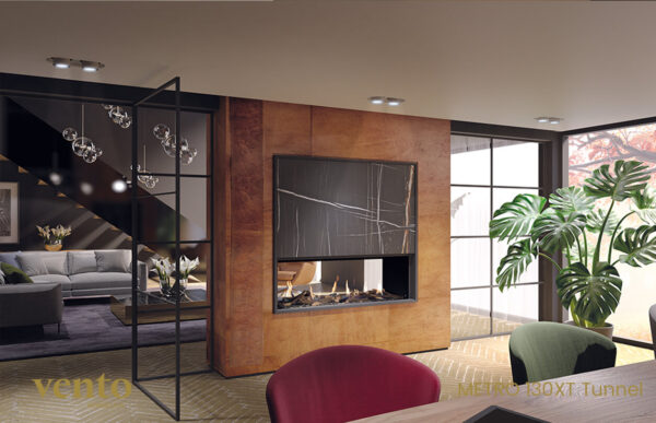 Gaskaminen Metro 130XT i tunneln finns för naturgas och gas på flaska. Den har en ”svart slät” bakgrund. Dessutom kan den fås med CV (clear view) antireflexglas