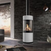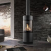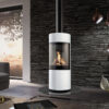 Denna moderna fristående gaskamin från DRU är iögonfallande på grund av sina stora runda glasfönster.