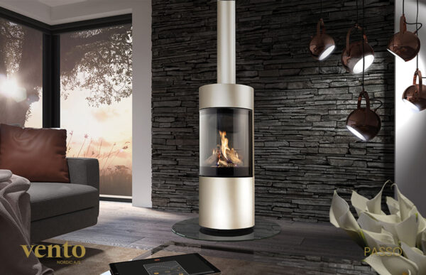 Flammönster kan regleras med hjälp av den integrerade Eco Wave-tekniken. Den glödande effekten längst ner i eldstaden och högstaplad ved skapar en vacker brasa. Gasspisen kan manövreras med fjärrkontroll eller via din smartphone eller surfplatta. Naturgas används för Passo.